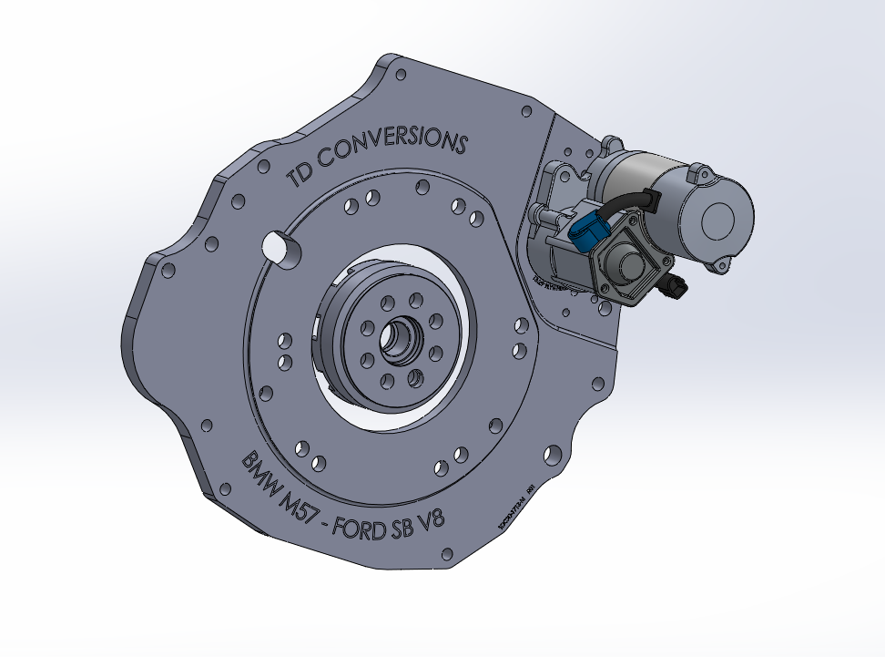This adapter kit allows you to attach a Ford Small Block V8 transmission to a BMW M57 turbo diesel engine (North American Models, 2.5L and 3.0L).